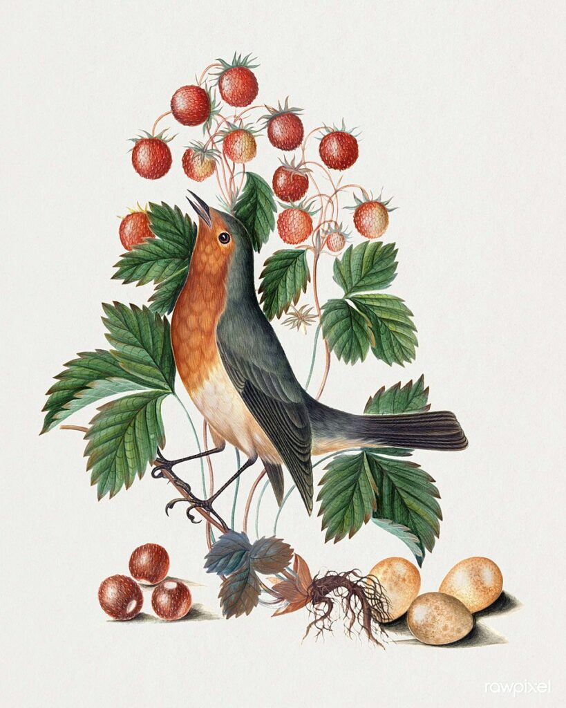 Rouge-gorge européen et fraises sauvages, James Bolton, 1768.