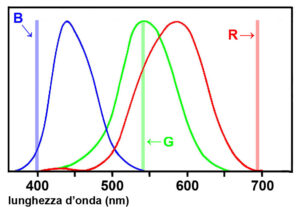 - L’usage veut plutôt qu’on les nomme en fonction de la gamme longueurs d’onde qui leur est associée, donc court (ou S pour « short » en anglais), moyen (ou M pour « middle ») et long (ou L pour « long »), mais je pense qu’il est plus simple et visuel, pour vous lecteur ou lectrice, de parler ici respectivement de B pour « bleu », V pour « vert » et R pour « rouge ». ↩︎