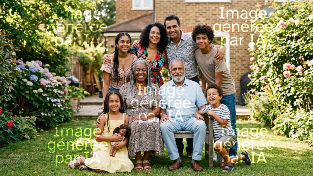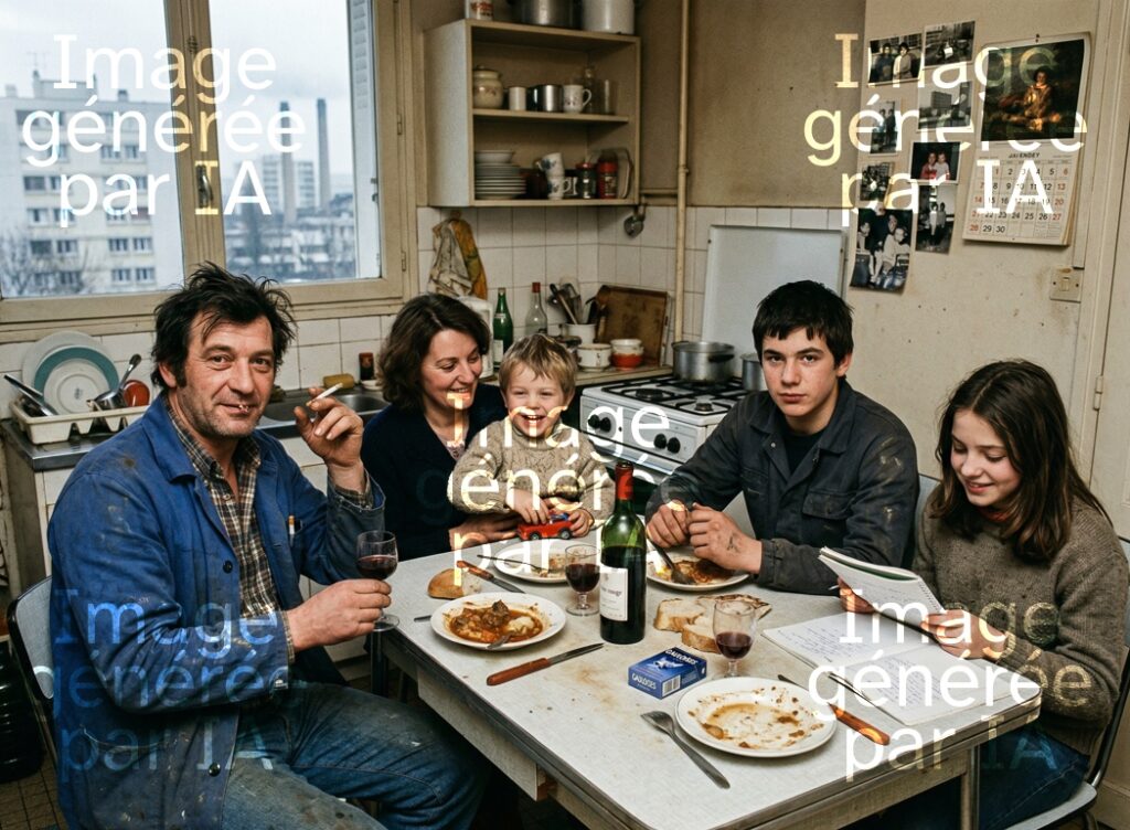 Bien évidemment, je pourrais aussi préciser à l’IA que je souhaite obtenir une photo de famille racisée. Mais là encore, elle joue son rôle normatif ; le mot « racisé » étant censuré, il me faut formuler autrement. Sans grande surprise, il est très difficile d’obtenir une photo de famille à la peau très foncée ; il semble bien que la méthode statistique de l’IA, qui moyenne tout, ne sache que diluer et éclaircir le noir. Elle n’a pourtant aucun problème à générer les peaux d’une blancheur extrême. Le problème illustré par cet exemple est évident, mais il démontre aussi comment dans diverses situations, lorsqu’un contenu est généré, il répond par défaut à un certain canon et qu’il faudra un effort volontaire, voire une certaine ingéniosité, à l’humain, pour sortir autant que possible de ce canon, ce qui fait clairement de l’IA un outil de normalisation des médias produit, et par conséquent, de la pensée et de la culture de toute la population qui y a recours. Il n’est au demeurant plus besoin de démontrer l’influence, sur nous tous et notre pensée, de l’industrie culturelle qui cherche à se saisir de l’IA comme d’un moyen de production à bas coût.